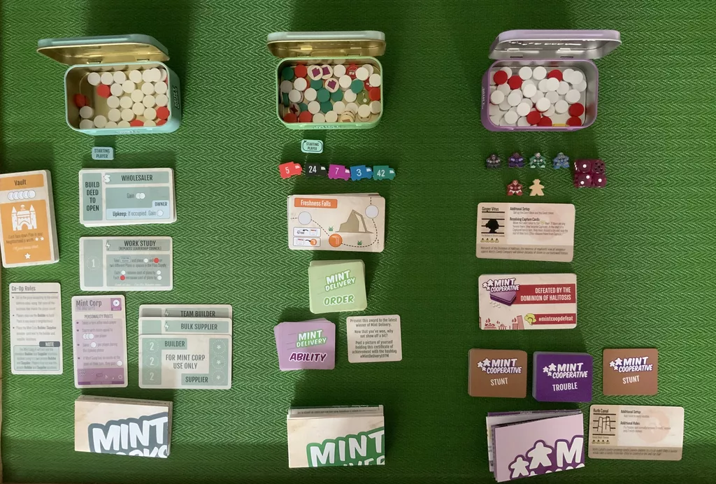 Mint Delivery is a mint tin-sized, pick-up-and-deliver board game designed to be quick-to-play and easy-to-learn. In the game, players take the role of a mint delivery truck driver, driving around the area taking orders for mints, then delivering ...